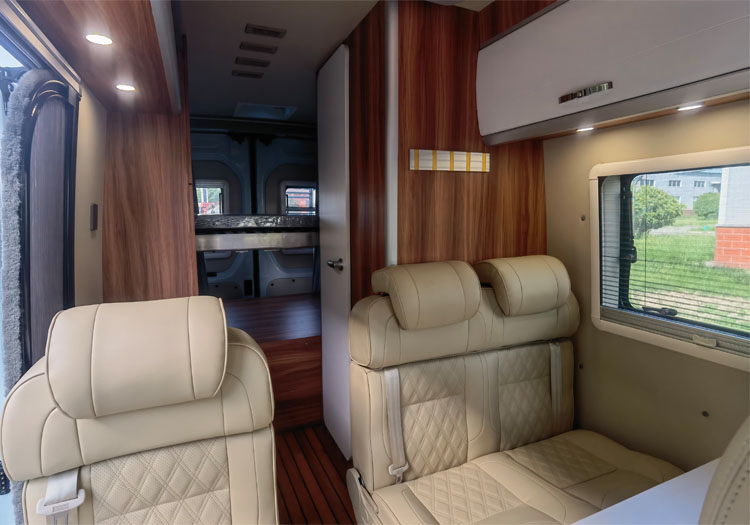 整车的布局从车头到车尾依次为驾驶室、厨房和客厅、卫生间和卧室。原木、浅灰、暖白的色彩搭配,清新典雅;筒灯、灯牌,简约明亮,让车内空间感更加立体;