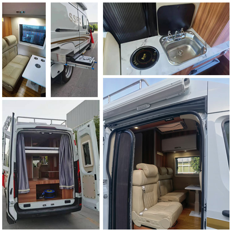 厨房区内配备各种生活设施:一体式微波炉、饮水机、油烟机、外置抽拉卡式炉、不锈钢水槽、房车专用冰箱和多个厨房储物柜。